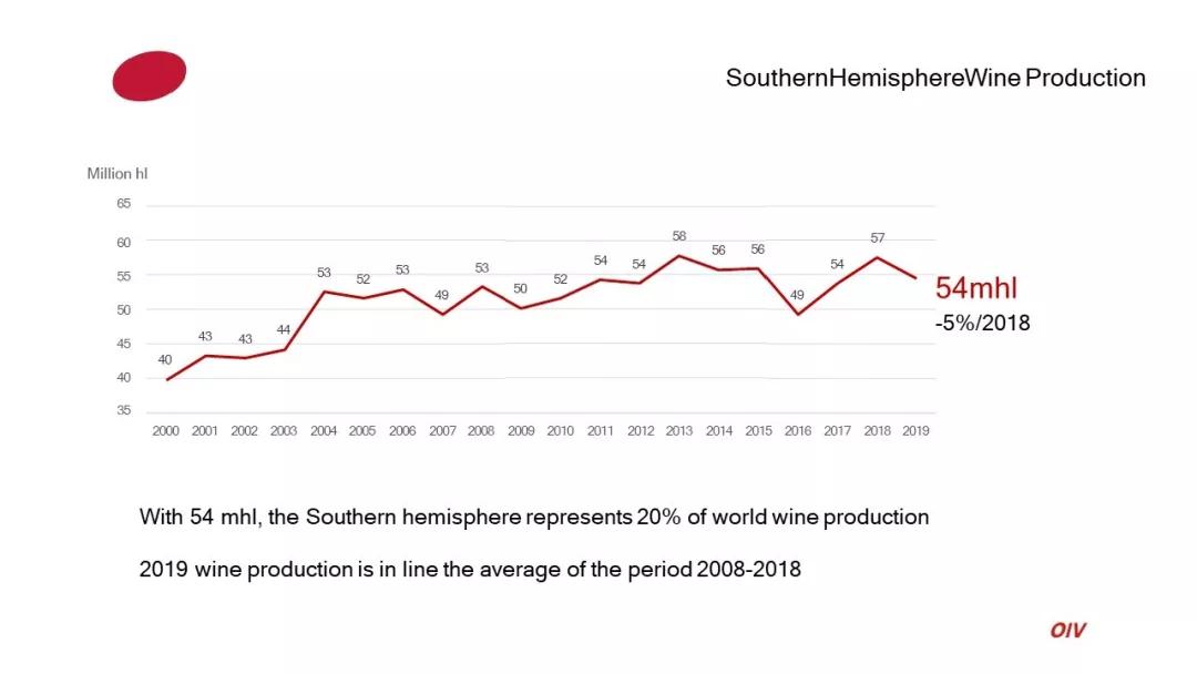 南半球2019年葡萄酒產量為54億升(mhl),占據全球葡萄酒產量的20%,與2008-2018年平均產量持平。