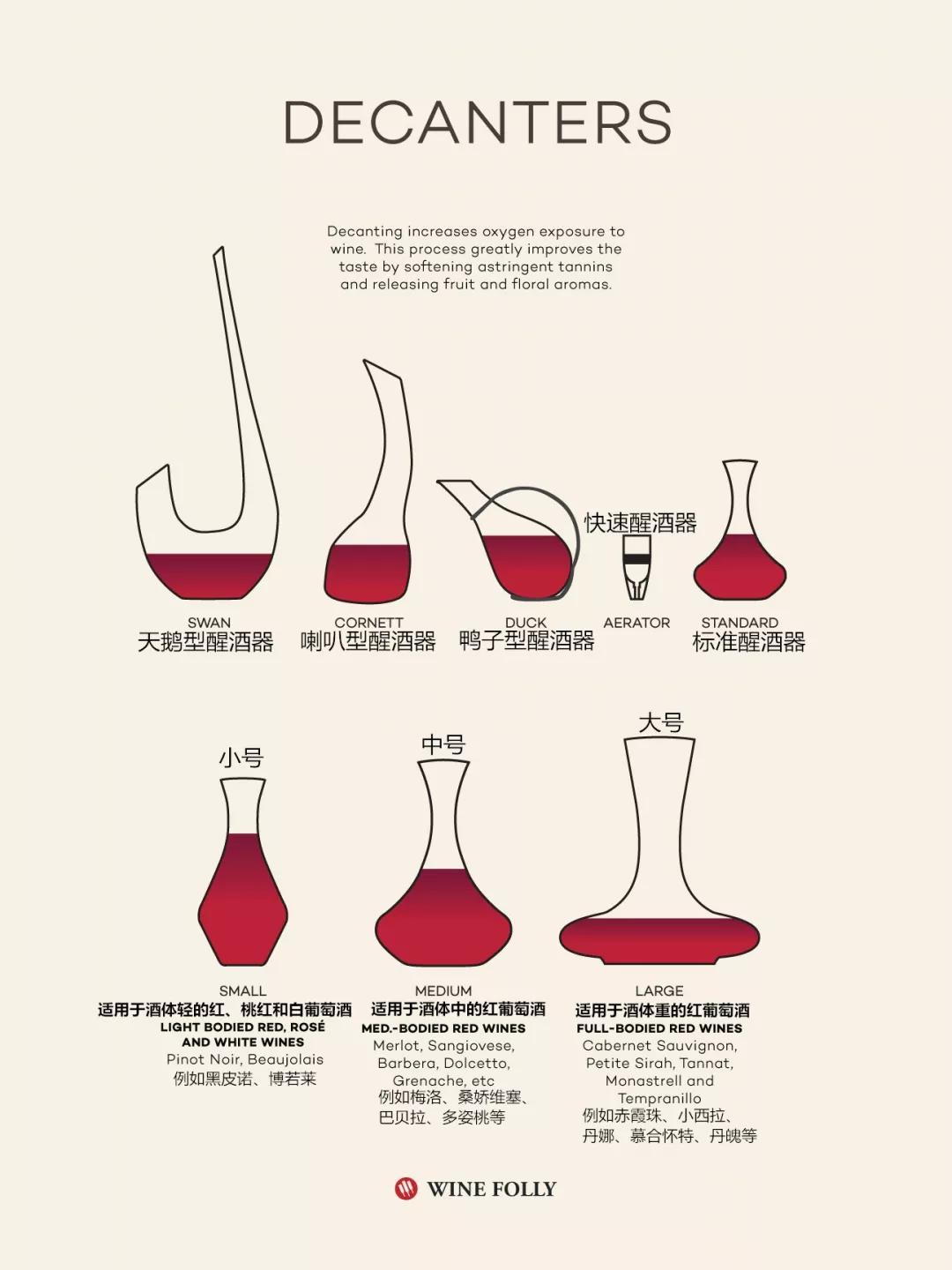這幾種形狀的醒酒器,基本上滿足了所有葡萄酒的需求。其中,小號的醒酒器也被稱為老酒醒酒器,其表面積較小,適合保護老酒纖弱的香氣和結構,年輕、強壯的葡萄酒,則適合中號或大號的醒酒器。