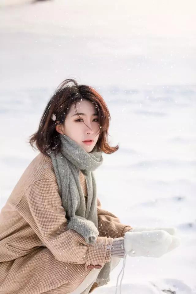 找一處雪比較多的地方,女生可以蹲在地上先玩雪,找個一個合適的角度,利用雪景可以將其看成純天然的白色背景布,回頭看鏡頭,眼神中透露出的熱情,足以溫暖寒冷的冬季。