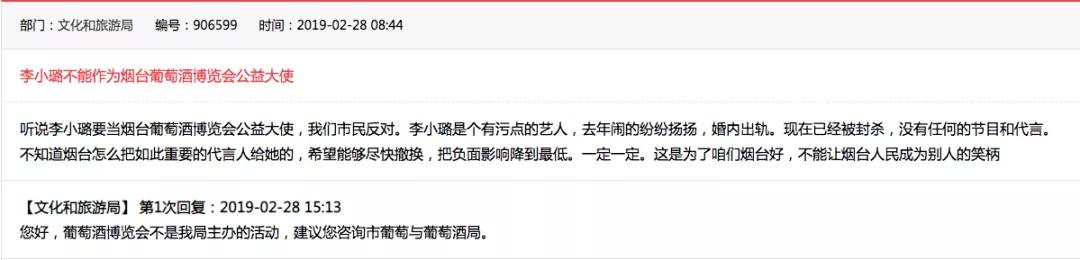 無獨有偶,今年初,煙臺國際葡萄酒博覽會想推陳出新,于是邀請李小璐擔任第十二屆煙臺國際葡萄酒博覽會的公益大使,希望“李小璐將利用她在巨大的粉絲影響力在中國全力推廣煙臺酒博會。”