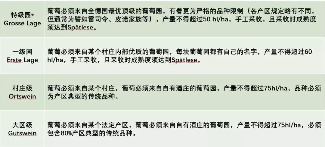 1971年,德國頒布了一套葡萄酒分級法規:葡萄采收時成熟度(最低含糖量,以予思勒度°Oe)越高,對應葡萄酒的等級就越高。
