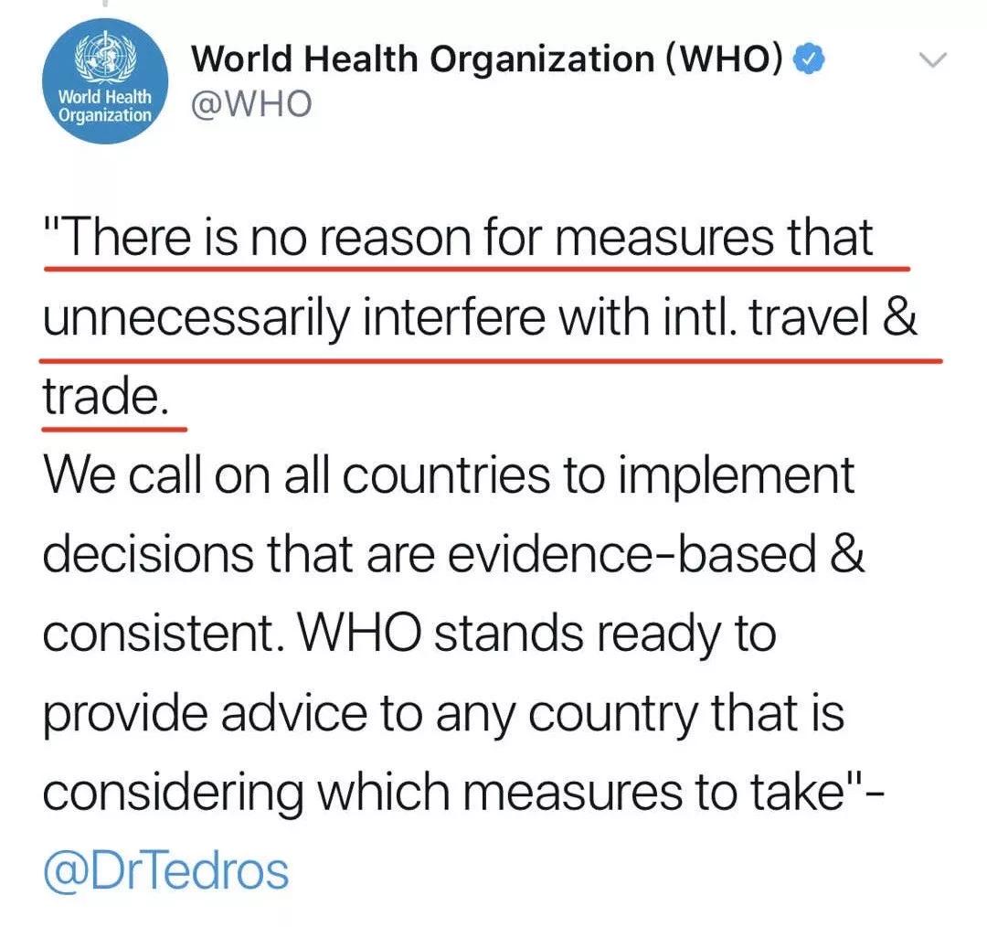 他強調,目前各國“沒有任何理由采取不必要的限制旅游和貿易的措施”。