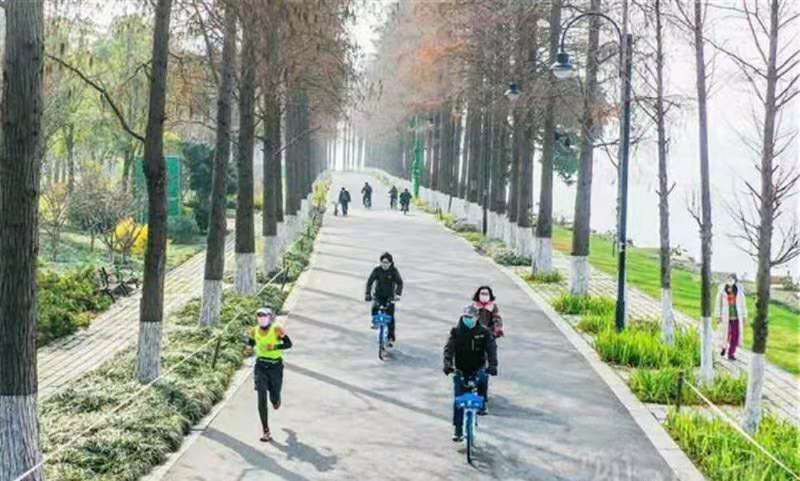 1月28日,大年初四。武漢封閉離漢通道第六天,終于迎了陽光明媚的一天。東湖綠道上戴著口罩騎行的人們。