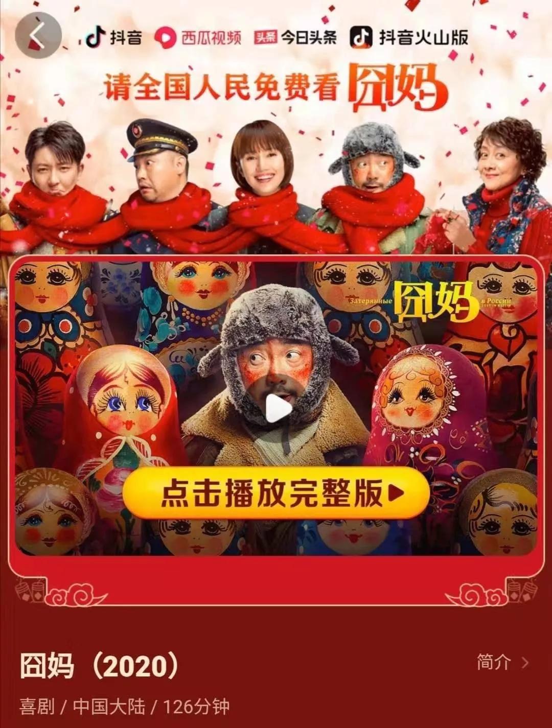 1月28日,字節(jié)跳動對外宣布,截至1月27日零時(shí),電影《囧媽》在頭條系四大平臺(抖音、西瓜視頻、今日頭條、抖音火山版)及智能電視鮮時(shí)光三日總播放量超過6億,總觀看人次1.8億。統(tǒng)計(jì)顯示,2019年整個(gè)春節(jié)檔全部影片前三日的觀影人次為7378.1萬。
