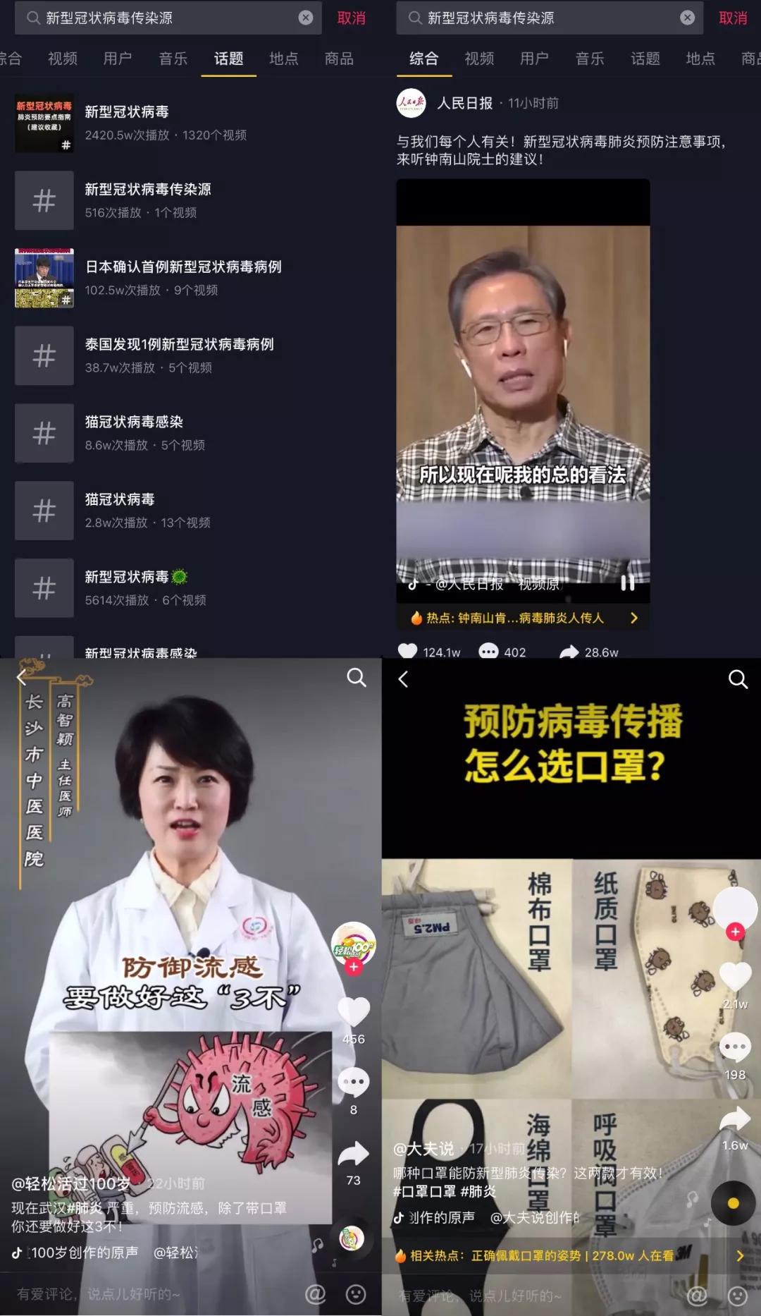 這一次的疫情趕上春節(jié),也正好是各大短視頻平臺火熱營銷的時(shí)機(jī),加上春節(jié)營銷的一層因素,抖音快手也能在疫情期間,抓住國民注意力流量,展現(xiàn)出作為內(nèi)容平臺的媒體與社會價(jià)值。 在快手抖音的熱搜上,“冠狀病毒肺炎”相關(guān)的話題都位列其中,人民日報(bào)發(fā)布的“鐘南山院士建議”、“習(xí)近平重要指示”,央視網(wǎng)發(fā)布的“冠狀病毒最新確診病例”等短視頻,播放量都在100萬以上,也都得到用戶極大的關(guān)注與討論熱度。
