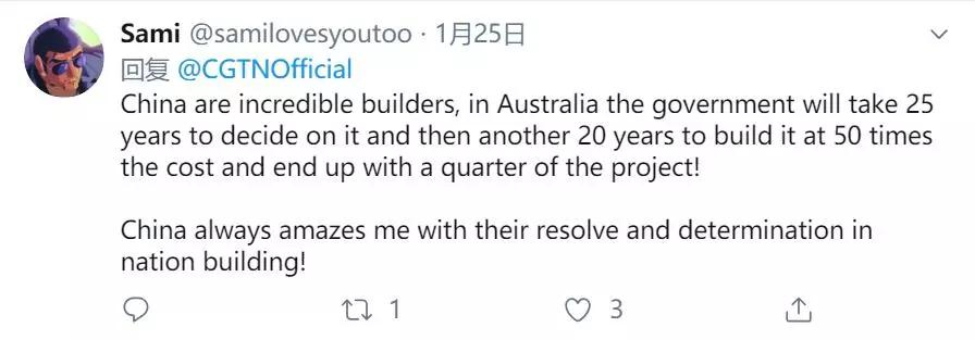 “中國真是令人難以置信的建設(shè)者,在澳大利亞,政府需要25年時(shí)間來做出決定,然后再用20年時(shí)間來建造,成本會是50倍,且最后僅以項(xiàng)目的四分之一完工!中國在國家建設(shè)方面的決心和果斷總是讓我吃驚!”