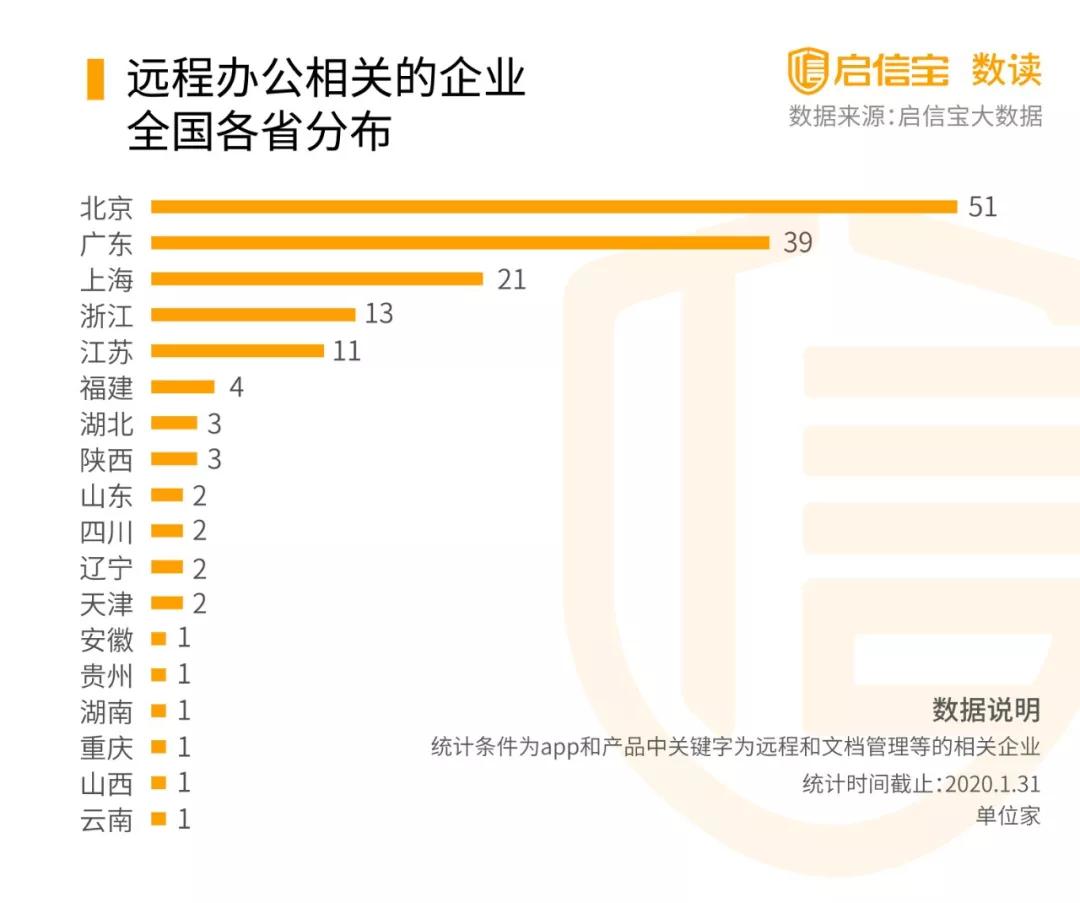 根據(jù)啟信寶數(shù)據(jù)統(tǒng)計(jì),全國共有159家有遠(yuǎn)程辦公的企業(yè),其中北京、廣東、上海分別數(shù)量為前三,可能受益會相對較大。