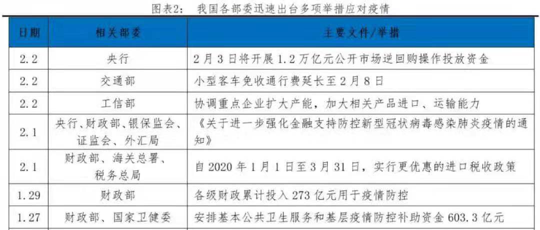 疫情發生后,央行、財政部、證監會等多部委快速出臺應對方案,釋放穩定預期信號,對沖疫情影響,為受疫情影響的地區、行業、企業提供信貸支持,保證企業資金鏈、現金流的接續,提振市場信心,維護市場穩定。