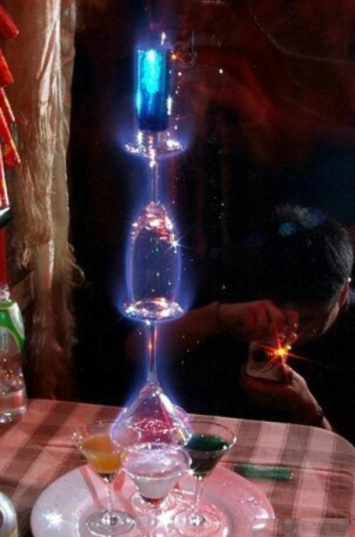 【噴火林寶堅尼】這款酒由于音譯不同,也有叫蘭寶堅尼的,總之都是這款酒。為什么要學會這款酒呢?看照片你便猜到一二了。酒吧里面,多聚集了年輕男女,他們平時就喜歡看好萊塢大片震撼的場面,這款酒絕對是你震撼全場的必殺技,學會它,準備接收各種各樣的驚嘆聲吧!