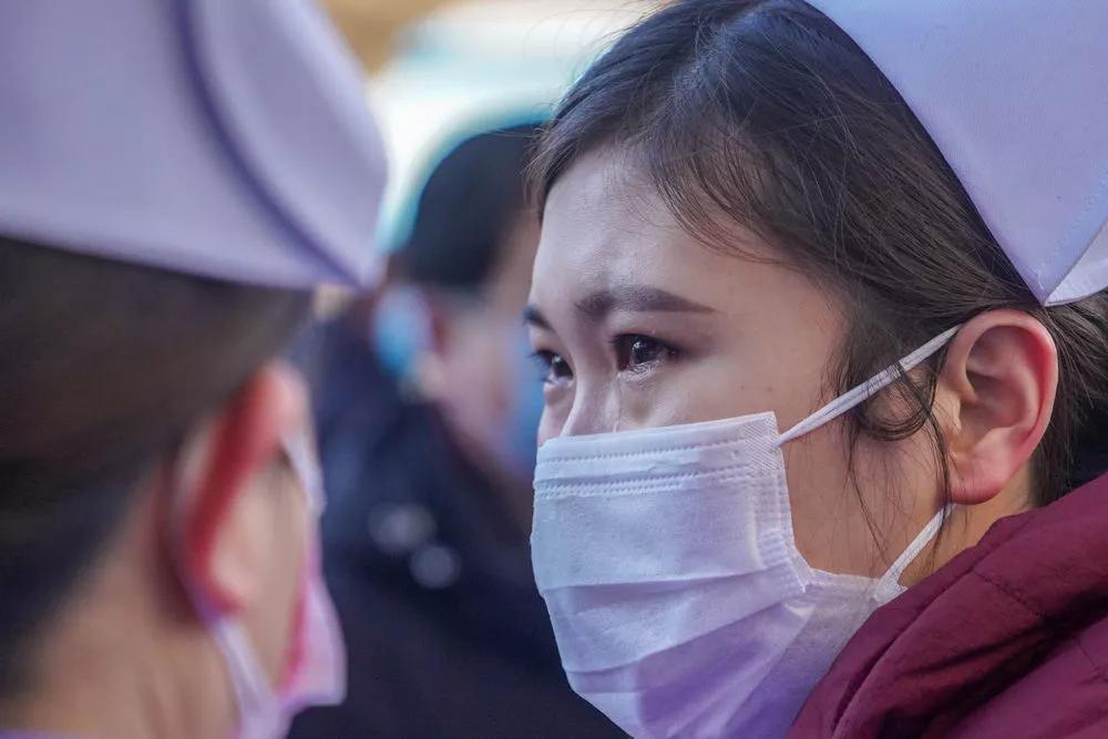 1月26日,在吉林省援助湖北省抗擊新型冠狀病毒感染肺炎醫療隊出征儀式現場,一名護士送別醫療隊同事時落淚。