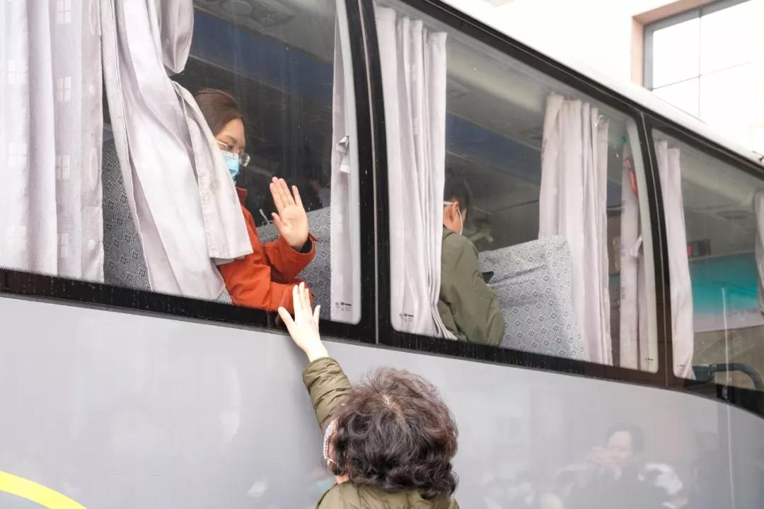 2020年1月27日下午3時許,在哈醫大二院,黑龍江省首批援助武漢醫療隊的成員們即將出發。車上的醫療隊員與家人依依惜別。
