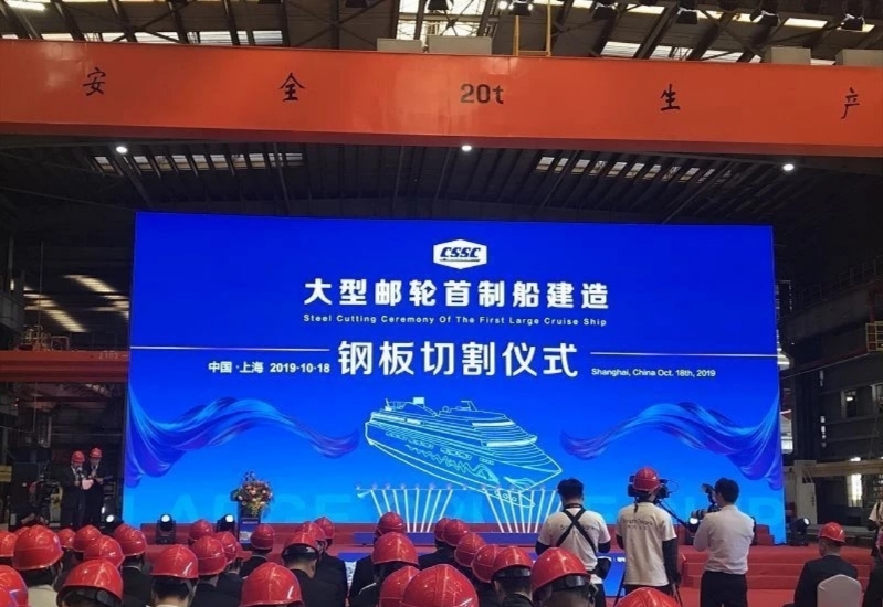 如果說效果圖是品牌還沒確定的產物,2019年10月18日上午10時40分左右,我國首艘國產大型郵輪在上海正式開工建設,現場的圖片依然是這樣的: