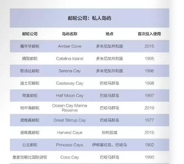 郵輪公司的私人島嶼幾家經營巴哈馬/加勒比海航線的郵輪公司都設有“私人島嶼沙灘日”行程。諾唯真郵輪在1977年購買了一個此前為軍事哨所的島嶼,引領了郵輪公司購買私屬島嶼的新趨勢。到目前為止,諾唯真已經花費數百萬美元用于升級島上設施。