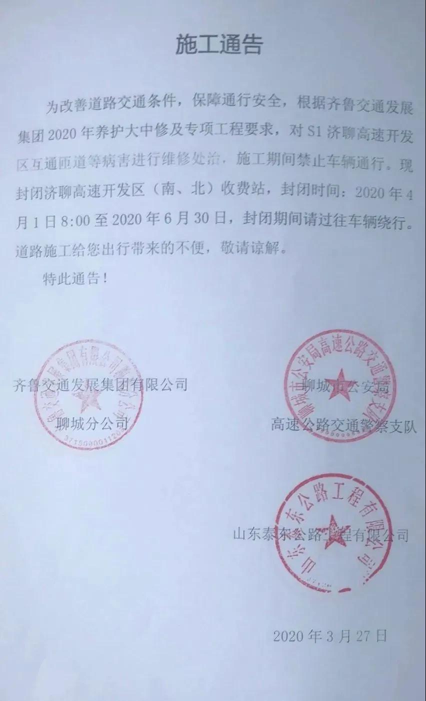 因濟聊高速開發區互通立交施工需要,2020年4月1日8:00至2020年6月30日,封閉濟聊高速聊城開發區收費站(南北崗),封閉期間請過往車輛繞行,道路施工給您出行帶來的不便,敬請諒解。