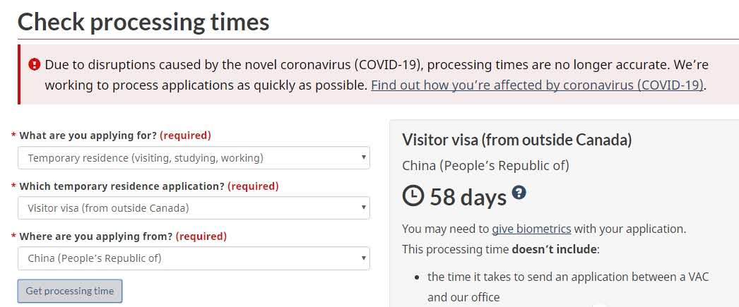 由于疫情的影響導(dǎo)致簽證申請中心持續(xù)關(guān)閉,所以簽證受理時間均有延遲。根據(jù)加拿大移民局系統(tǒng)查詢,目前顯示臨時訪問簽證審理時間延長至58天,不排除再延長的可能性。