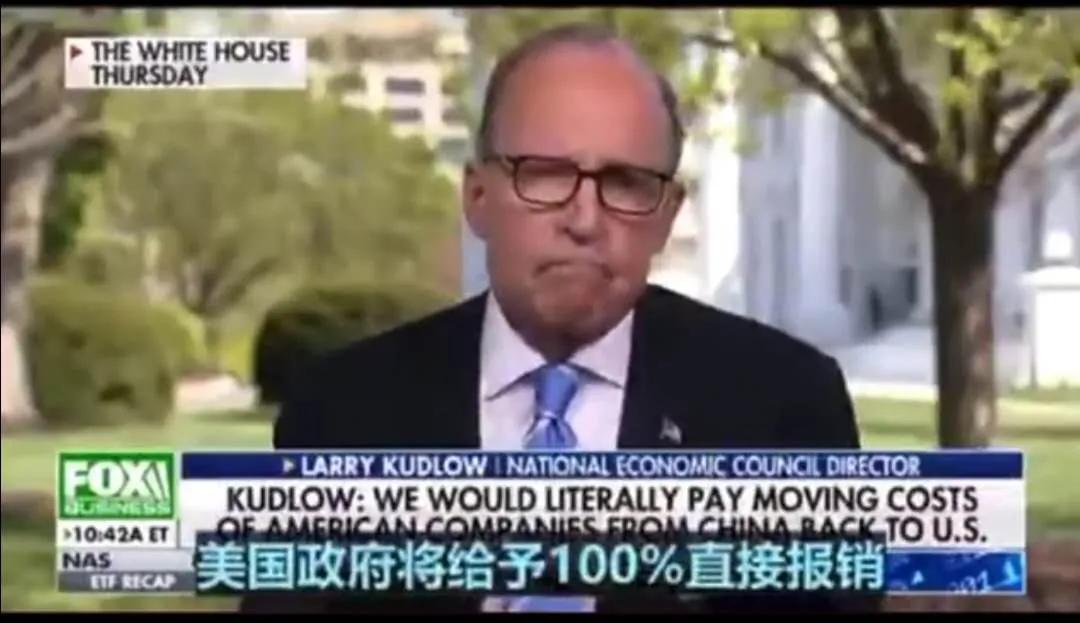 據“環(huán)球時報”綜合路透社、彭博社的報道,美國白宮的國家經濟委員會主任拉里·庫德洛(Larry Kudlow)建議,通過“報銷全部費用”的方式,吸引美國企業(yè)從中國遷回美國。