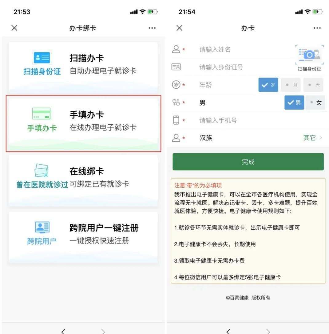 進入“健康聊城”公眾號,點擊下方“醫(yī)療健康”,第一次使用的用戶會跳轉(zhuǎn)到辦卡綁卡界面,點擊“手填辦卡”填寫信息:
