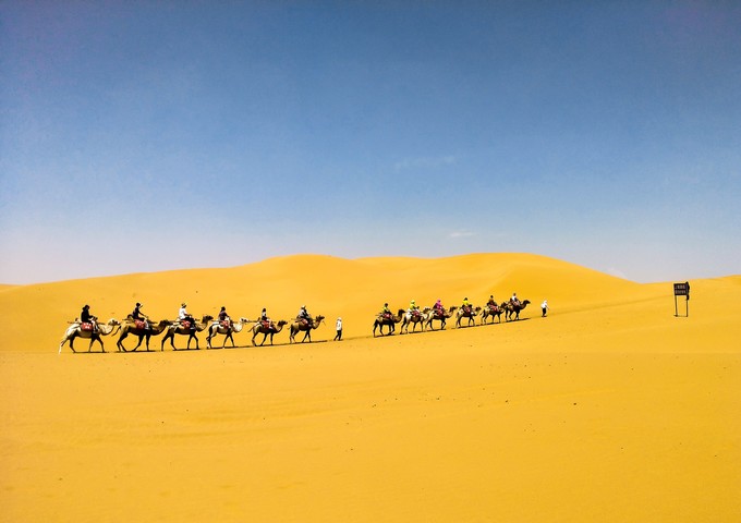 在景區內,你可以選擇乘坐景交車前往沙漠區,也可以步行前往。在沙漠區之前還會路過3d玻璃橋、黃河索道、黃河蹦極的娛樂設施,充分滿足了每位旅客。到沙漠區后,最先進入你視野的是一座陡峭的沙山,沙梯被掩埋在黃沙之中,如果你不想步行爬上去,也可以選擇不遠處的電梯上山。沙山頂部是一個寬闊的平臺,在這里可以一睹沙坡頭景區的全貌,尤其是如東方巨龍般的黃河,滔滔河水仿佛直通天際。平臺的盡頭是一個車站,每個前往沙漠地帶