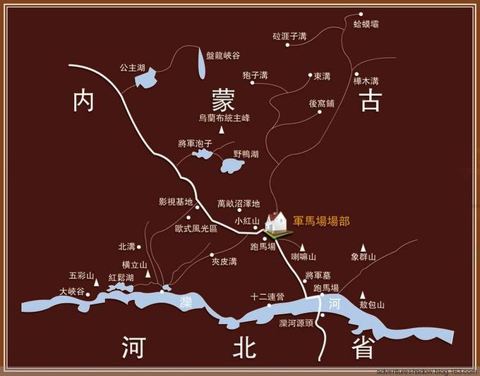 北京京承高速—圍場北或南出口下—御道口牌坊—大河口—撅尾巴河村—烏蘭布統景區售票處西站—元寶山—烏蘭布統