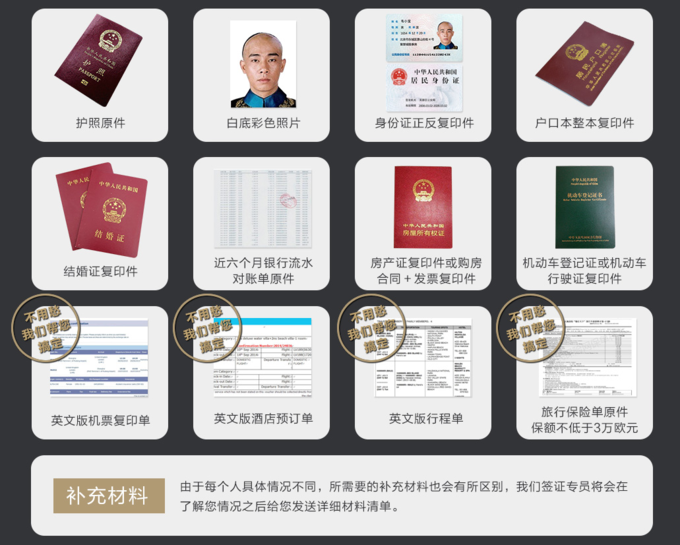 中國大陸因私護照(必要)、2寸白底照片(必要)、 保險(必要)、出行證明 (必要) 、在職證明 /退休證/在讀證明(必要)、 銀行流水 (必要) 、營業執照(必要)、身份證復印件 (必要) 、戶口本復印件(每一頁)(必要) 、結婚證 (可選) 、 車產(可選)、房產 (可選) 等等。 根據領區不同可能會有微妙區別。