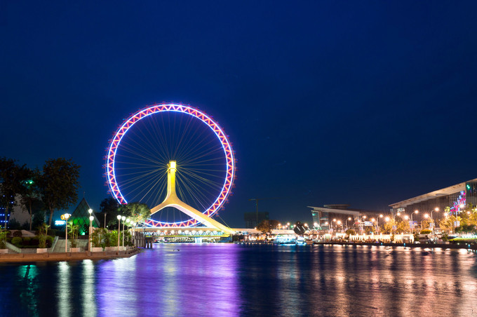天津之眼坐落在天津市紅橋區(qū)海河畔,是一座跨河建設(shè)、橋輪合一的摩天輪,兼具觀光和交通功用。摩天輪旋轉(zhuǎn)一周所需時間為28分鐘,到達(dá)最高處時,周邊景色一覽無余,甚至能看到方圓40公里以內(nèi)的景致。直徑為110米,輪外裝掛48個360度透明座艙,每個座艙可乘坐8個人,可同時供384個人觀光。轉(zhuǎn)動速度緩慢,并不刺激。你可眼見車輛從兩邊疾馳而過,別有妙趣。