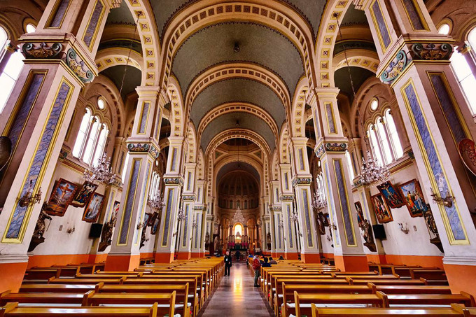 教堂外部用紅黃相間花磚砌成,三座呈品字形排列、高聳入云的塔樓上浮蓋著綠色銅片,塔樓頂上各有一個青銅十字架。走進(jìn)教堂,映入眼簾的首先是湖藍(lán)、白色、淡黃構(gòu)成的內(nèi)部主色調(diào),給人一種清新的感覺,14根立柱從門口排列到祭臺。教堂四周列著一座座精美的教徒銅像,墻壁上則掛著一幅幅記述耶穌受難故事的油畫,教堂內(nèi)還有圣母、耶穌、天使等的彩色塑像。