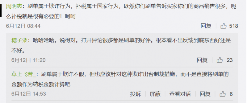 據新浪科技,一位在電商平臺做運營的王女士表示,如果以刷單的數據進行繳稅,比如13%的稅點,刷了100塊錢的東西,就要再加13塊錢的費用,現在淘寶或者天貓的一些賣家,利潤率根本就沒有這么高,因為很多賣家是做性價比和低價的。“淘寶搜索銷量在前的,基本上都不是價格很高的,是那種性價比較高的商品,其利潤就沒有那么高,商家自然也承擔不了這么高的稅額費用,因為之前不用繳稅,可能利潤在10%。現在如果要交13%的稅,等于在賠錢。”