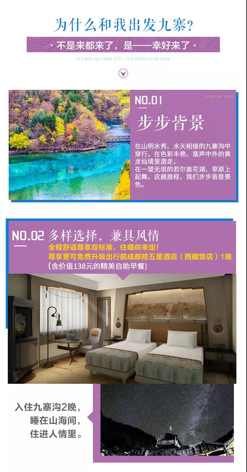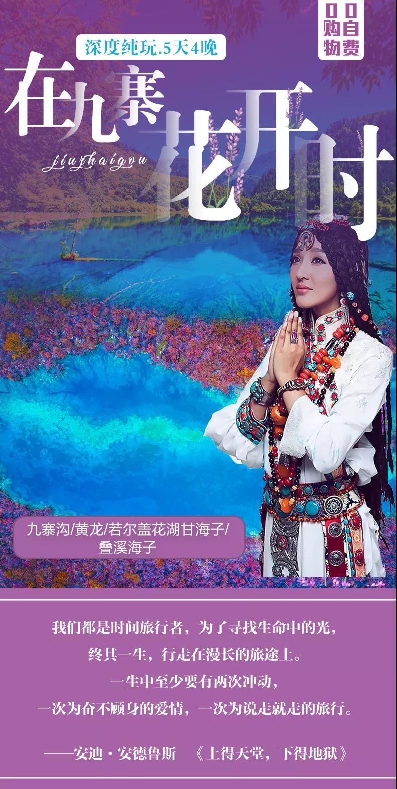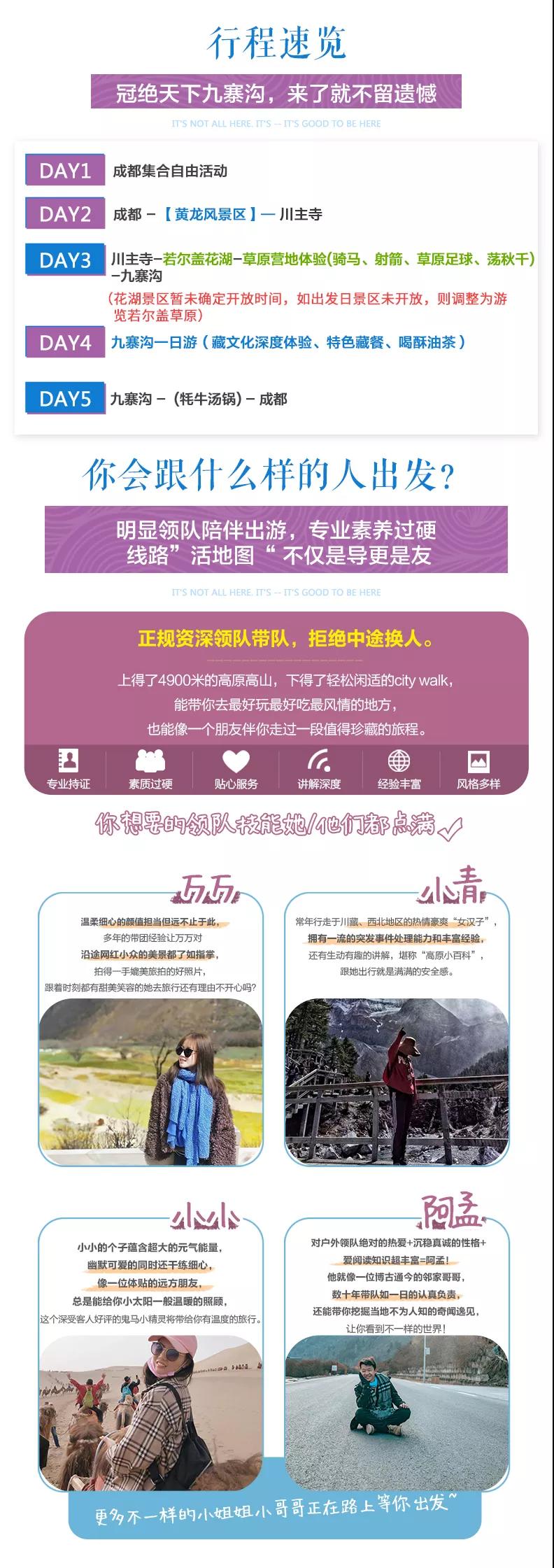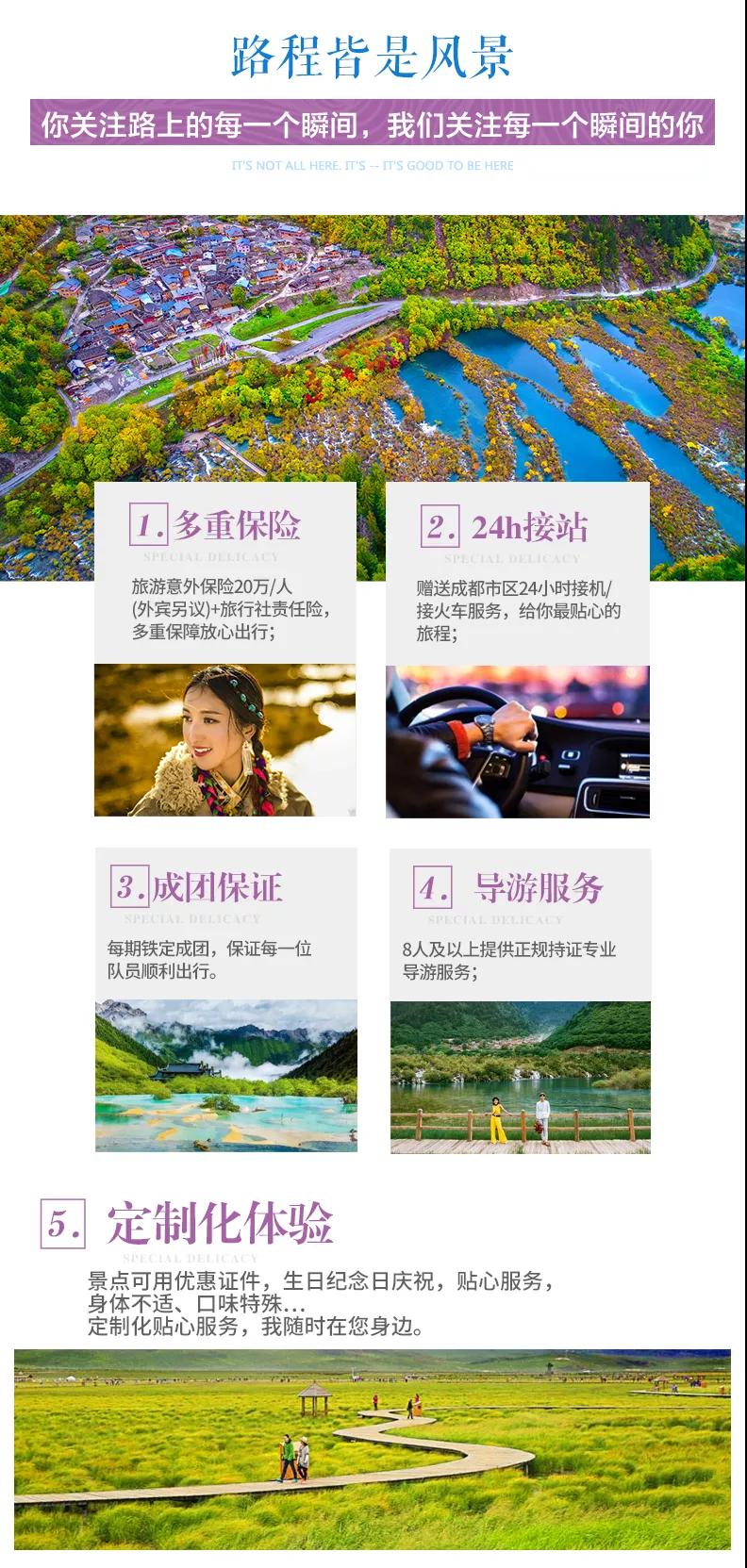 3、九寨溝面積較大游客需求不一,因此主要以游客自助游形式游覽,如無導游陪同望您諒解。游覽開始前導游會與您約定好集合時間,請務必按時到達指定地點,避免耽誤大家接下來的行程;