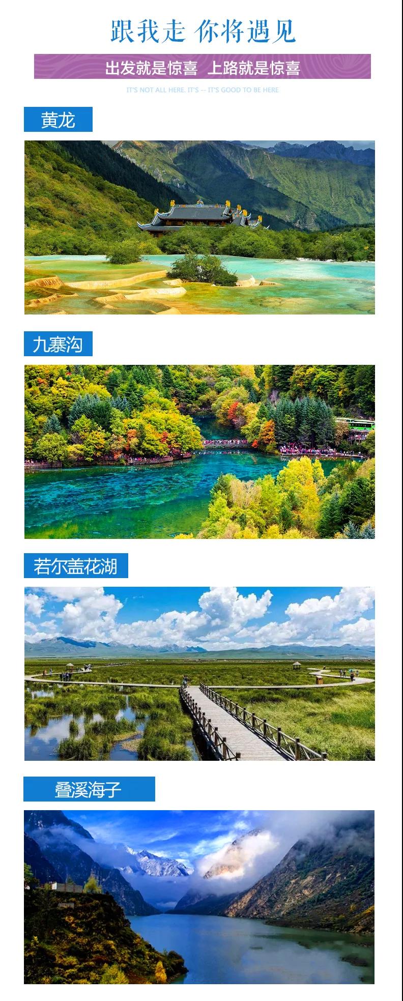 九寨溝門票、黃龍風景區門票、若爾蓋花湖門票(花湖景區暫未確定開放時間,如出發日景區未開放,則調整為游覽若爾蓋草原);