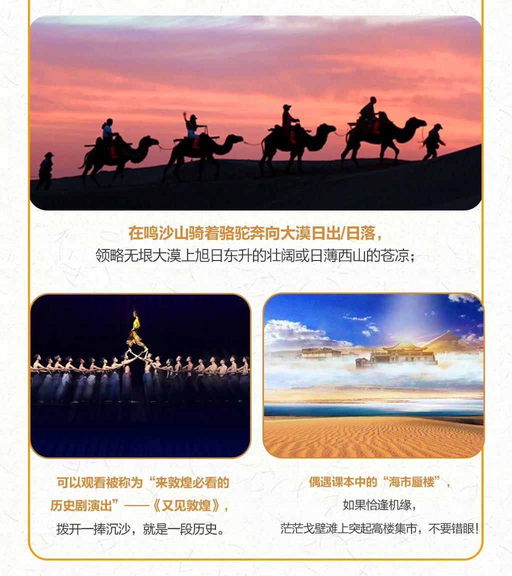 西北地區天氣干燥,旅途的過程中請大家多喝水,注意防曬;敦煌《又見敦煌》演出,旅游淡季298元/人,旺季368元/人起;果木烤全羊費用根據羊的大小決定,由參與活動的游客均攤,一般10人一桌,人均消費160元左右。