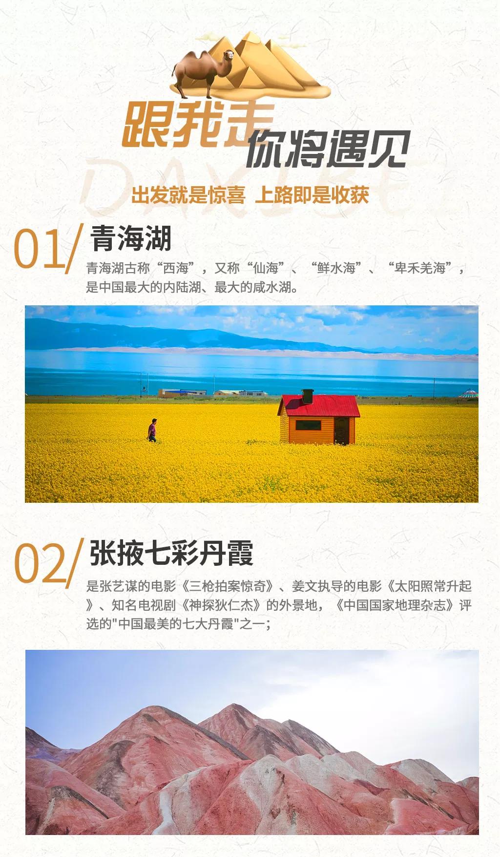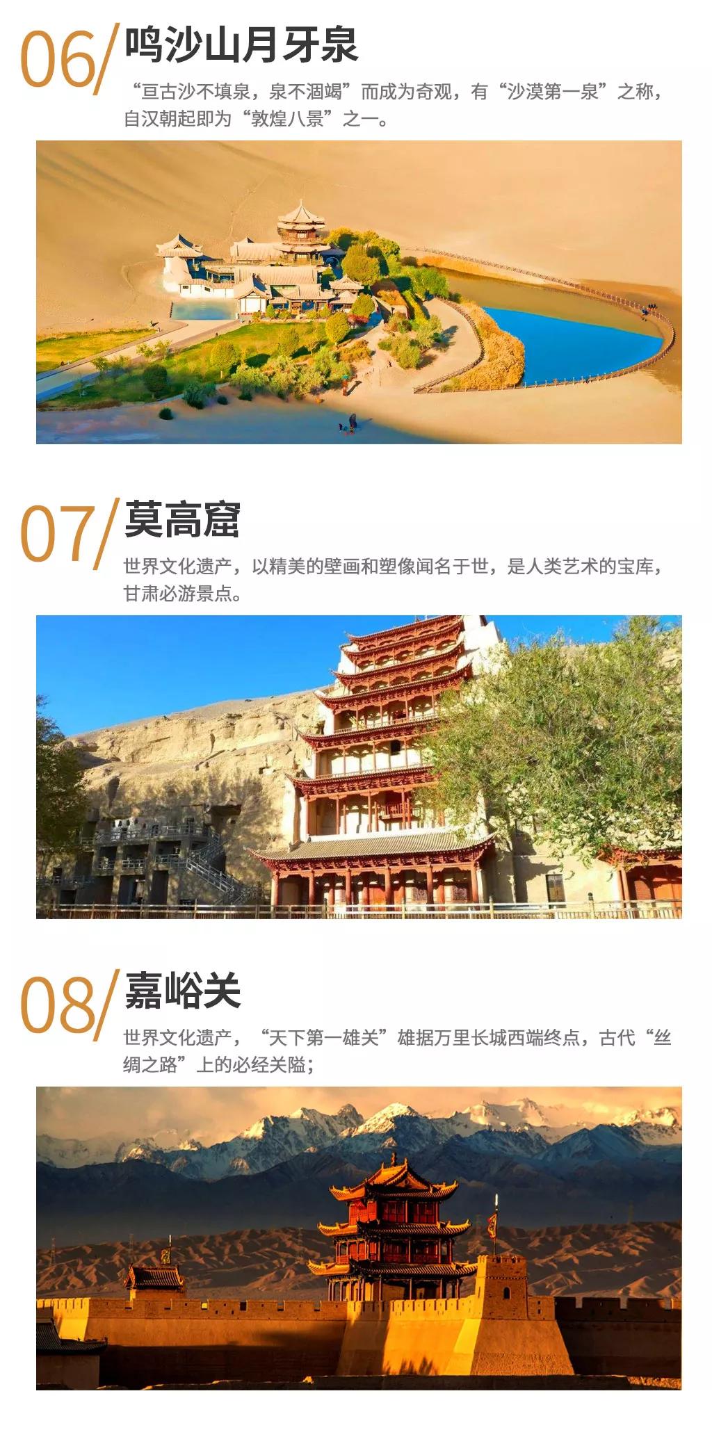 門票:莫高窟門票、張掖丹霞門票(含觀光車)、嘉峪關門票、鳴沙山門票、石油小鎮門票、茶卡鹽湖門票、青海湖二郎劍景區門票。(莫高窟普通門票構成:門票180元/人+交通費10元人+莫高窟數字展示中心48元/人;莫高窟應急票構成:門票90元/人+交通費10元/人)