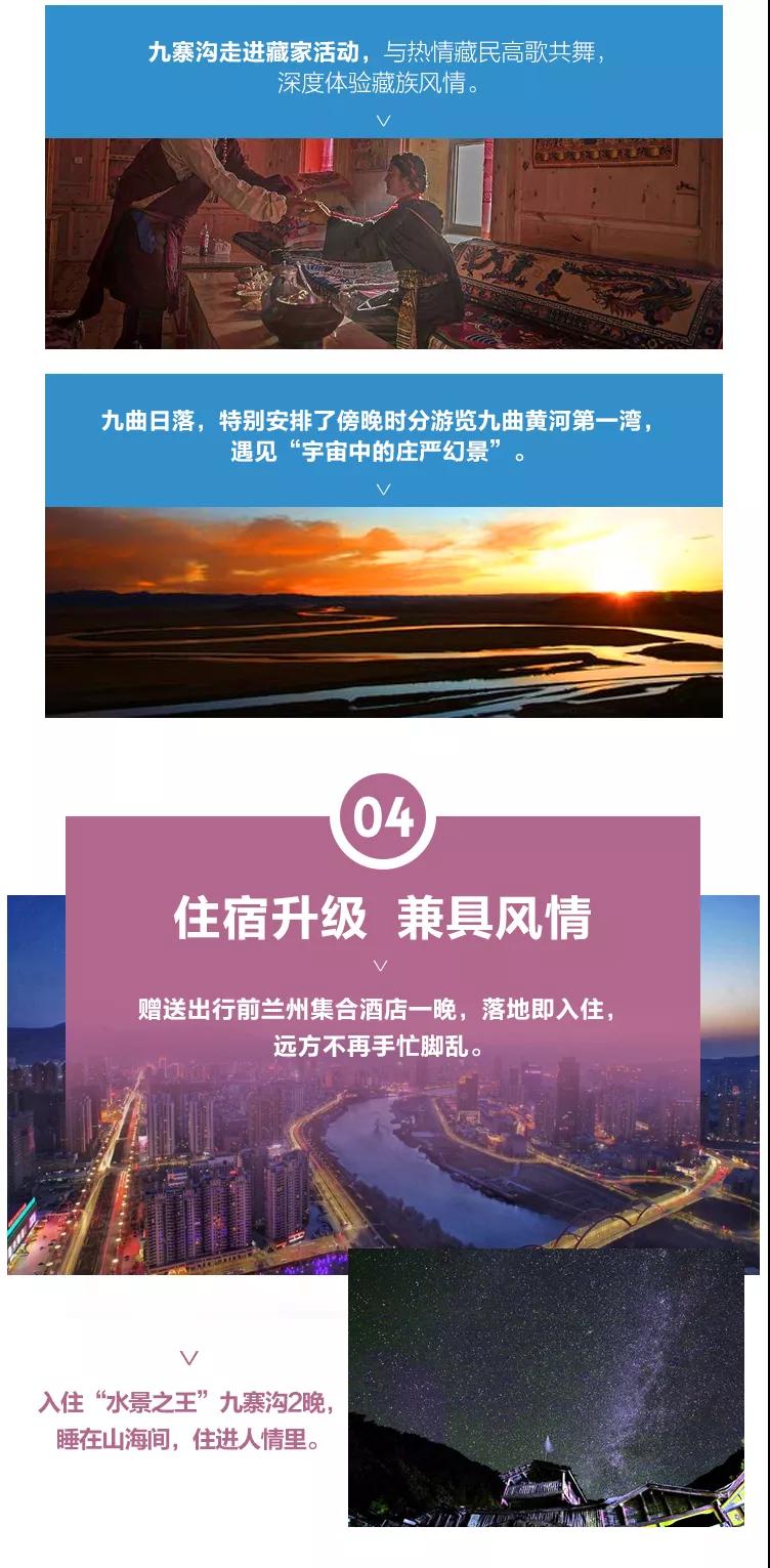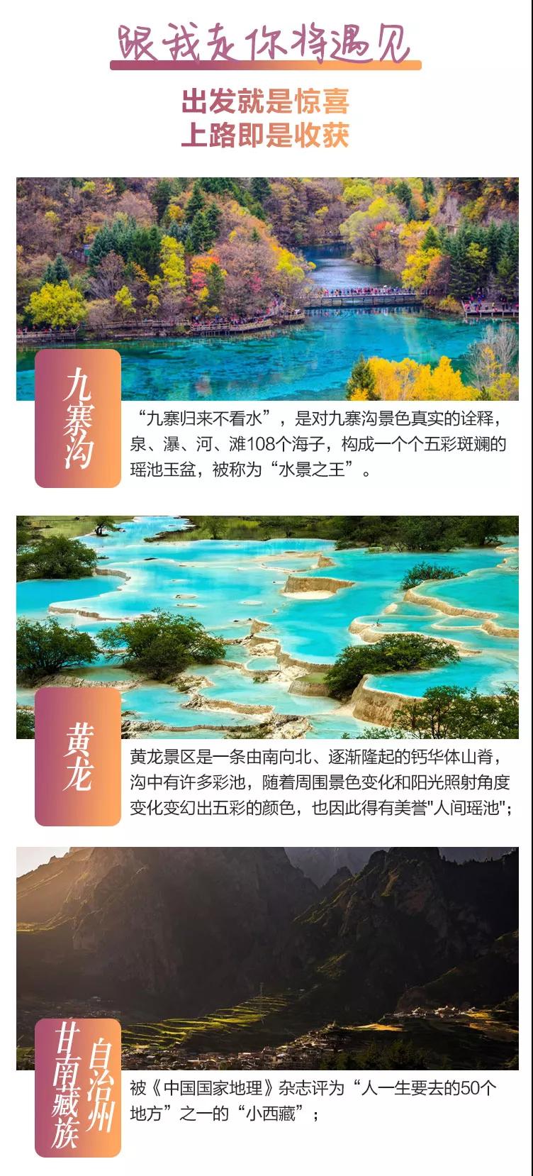 4、九寨溝景區實行分區域開放,開放區域為溝口經諾日朗瀑布至長海,扎如溝的扎如寺及日則溝的鏡海;其中,長海、五彩池、鏡海、諾日朗瀑布、樹正群海、雙龍海瀑布、扎如寺等景觀原則上為步行游覽區,具體游覽方式請聽從隨車講解員安排;