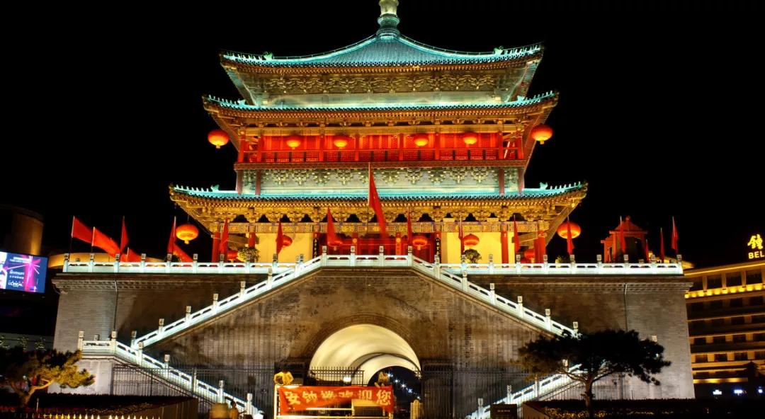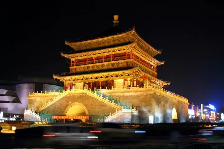 西安鐘樓始建于明洪武十七年,是一座重檐三滴水式四角攢尖頂的閣樓式建筑,面積1377.64平方米,建在用青磚、白灰砌成的方形基座上。西安鼓樓始建于明洪武十三年建于高大的長方形臺基之上,臺基下辟有高和寬均為6米的南北向券洞。