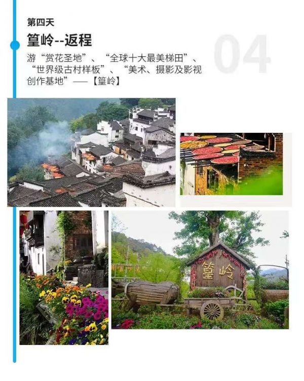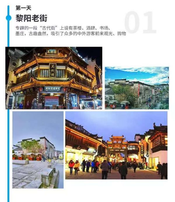 到達黃山市后自由逛黎陽老街:今黃山市屯溪區黎陽鎮的舊時街市,與屯溪老街隔江相望。屯溪老大橋(原名鎮海橋)作為他們之間的唯一通道橫跨其間。老大橋往南,走過一座橫跨在名為河底溪的小溪上的西鎮橋就是黎陽老街。大部分舊宅不復存在,但依然留下了具有徽州傳統風格的徽派民居數座及民國石庫門風格的老宅。 老屯溪人代代相傳的俗語“明清個屯溪,唐宋個黎陽”,它隱隱地告訴了我們黎陽在昱城人心中的分量。