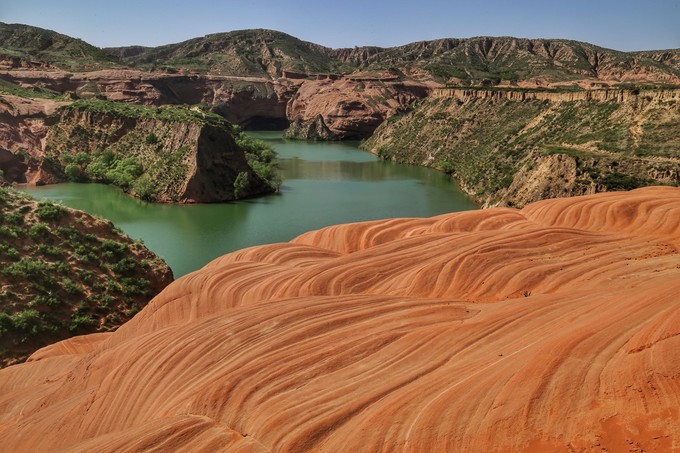 從B停車場出發(fā),沿小路向前走不多遠,前面就能看到幾個丹霞紅砂巖山丘,右手邊是土橋和大灣畔兩個水庫中間的一個過渡的水塘。在半島西北角的山坡下邊有一片水浪波紋的紅砂巖,這里是這個區(qū)域最驚艷的地方,不僅可以看到碧水藍天,還能夠眺望對面大面積的丹霞紅石,最重要的是可以近距離接觸大片波浪紋路的紅砂巖。
