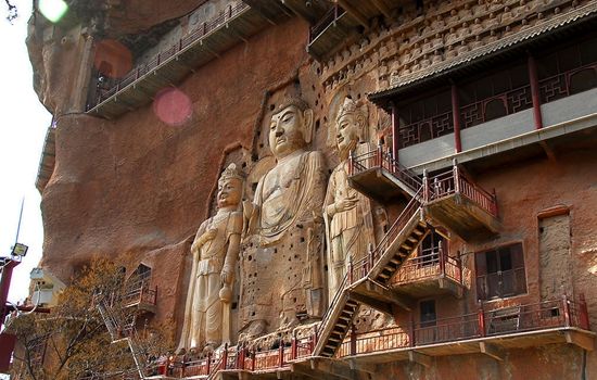 麥積山石窟屬全國重點文物保護單位,建自公元384年,后來經過十多個朝代的不斷開鑿、重修,遂成為我國著名的大型石窟之一,也是聞名世界的藝術寶庫。麥積山石質皆為紫褐色之水成巖,其山勢陡然起獨峰,最初有許多天然之巖洞。它的海拔1742米,山頂距地面142米,現存洞窟194個,其中有從4世紀到19世紀以來的歷代泥塑、石雕7200余件,壁畫1300多平方米。由于麥積山山體為第三紀沙礫巖,石質結構松散,不易精雕細鏤,故以精美的泥塑著稱于世,絕大部分泥塑彩妝。被雕塑家劉開渠譽為“東方雕塑陳列館”。它的開鑿年代,大部分學者認為始于后秦,歷經北魏、西魏、北周、隋、唐、五代、宋、元、明、清歷代都有不斷地開鑿和修繕,現存造像中以北朝造像原作居多。麥積山石窟的一個顯著特點是洞窟所處位置極其驚險,大都開鑿在懸崖峭壁之上,洞窟之間全靠架設在崖面上的凌空棧道通達。游人攀登上這些蜿蜒曲折的凌空棧道,不禁驚心動魄。古人曾稱贊這些工程:“峭壁之間,鐫石成佛,萬龕千窟。碎自人力,疑是神功。”附近群眾中還流傳著“砍完南山柴,修起麥積崖”,“先有萬丈柴,后有麥積崖”的諺語。可見當時開鑿洞窟,修建棧道工程之艱巨、宏大。