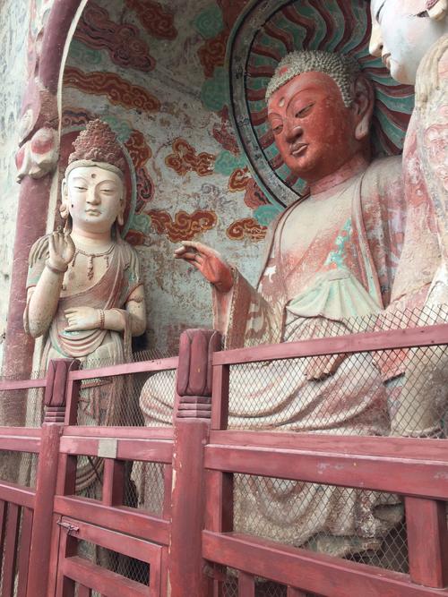 麥積山的洞窟很多修成別具一格的“崖閣”。在東崖泥塑大佛頭上15米高處的七佛閣,是我國典型的漢式崖閣建筑,建在離地面50米以上的峭壁上,開鑿于公元6世紀中葉。麥積山石窟雖以泥塑為主,但也有一定數量的石雕和壁畫。麥積山石窟被列為國家重點文物保護單位,新架和修復了1300多米的凌空棧道,使游人能順利登臨所有洞窟。麥積山石窟的造像最高大者達16米,最小者僅為10余厘米。其中第44窟造像被日本人稱為“東方的維納斯”。西秦的78窟 、128窟的造像的僧衣細致地繪出了圖案。建于七十余米高的的七佛閣上塑像俊秀,過道頂上殘存的壁畫精美絕倫,其中西端頂部的車馬行人圖,無論從哪個角度看車馬所走方向均不相同,堪稱國內壁畫構圖之經典之作。