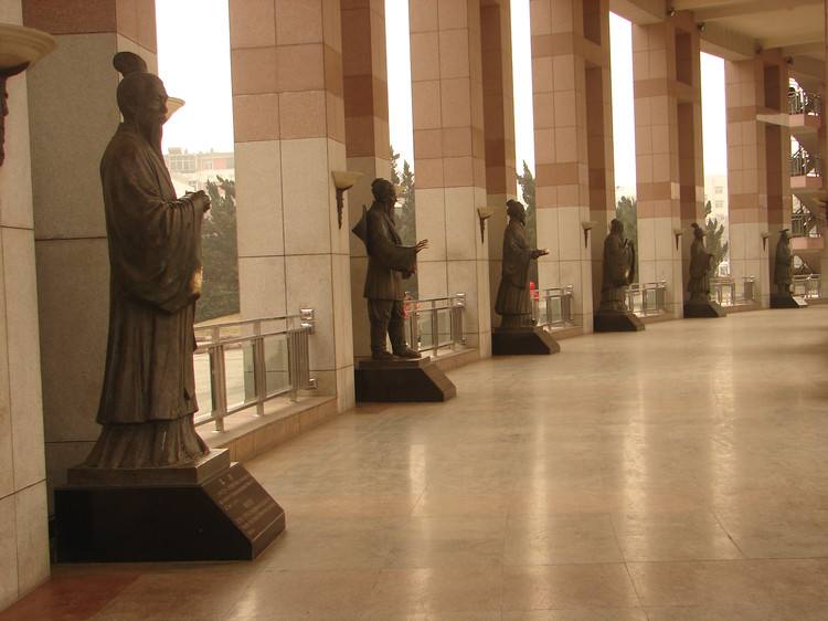 文化長廊位于泉城廣場東側,是泉城廣場東部重要標志性建筑物,也是登高欣賞廣場全貌的最佳場所。文化長廊呈圓弧狀,南北長150米,高16米,分三層。墻身嵌以中國傳統柱式造型,體現了傳統文化內涵。長廊內設大舜、管仲、孔丘、孫武、墨翟、孟軻、諸葛亮、王羲之、賈思勰、李清照、戚繼光、蒲松齡12尊歷史名人雕塑,鑲嵌在長廊南北兩端及西立面柱基上的14幅浮雕有東方曙光、舜耕歷山、伯禽治魯、太公封齊、管仲霸齊、晏嬰諫君、孔子講學、子貢貨殖、孫武兵法、稷下爭鳴、孟子游說、魯班學藝、扁鵲行醫、鄒衍辯論。這組浮雕命名為《圣賢史跡圖》。