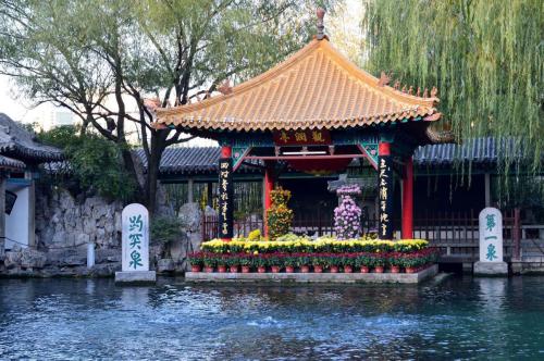 請大家跟我來。趵突泉公園位于濟南市中心,南靠千佛山,東臨泉城廣場,北望大明湖,面積近11萬平方米。趵突泉公園是一座以泉水為主的自然山水公園,其內(nèi)趵突泉又名檻(jian,kan)泉,為濼(luo)水之源,是濟南七十二名泉之冠,被譽為“天下第一泉”,至今已有2700年的歷史,水溫一年四季恒定在攝氏18度左右。趵突泉公園以觀泉、賞魚、品茶、山石文化為特色,以小巧玲瓏、步移景異、清潔幽靜、古樸典雅而著稱。