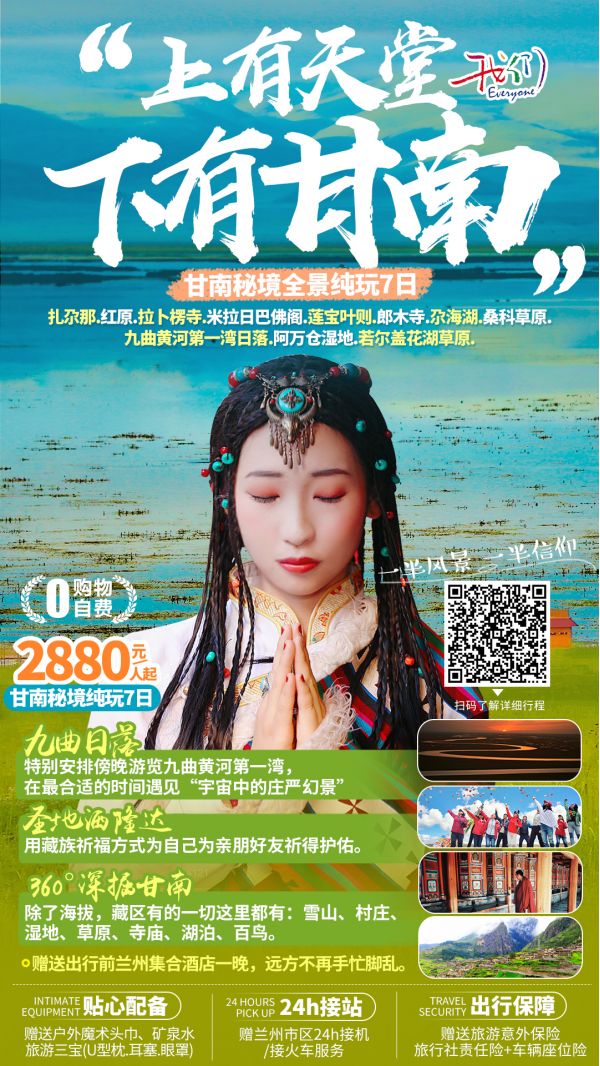 扎尕那+拉卜楞寺+若爾蓋花湖草原+米拉日巴佛閣+蓮寶葉則+郎木寺+尕海湖+九曲黃河第一灣日落+阿萬倉濕地六晚七天