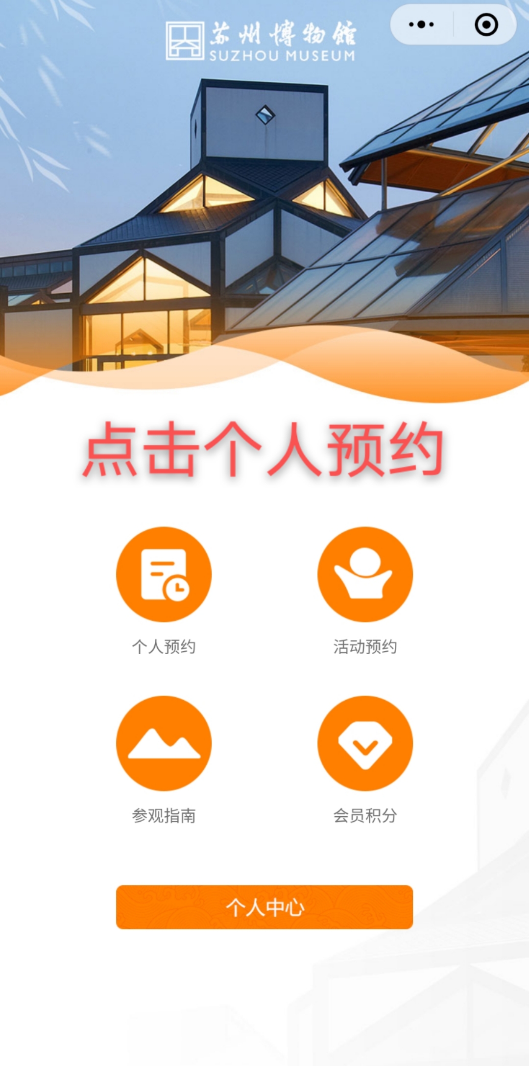 1)預約個人入館通道(6人及以下)個人可提前七天登錄蘇州博物館官方網站、蘇博官方微信公眾號、蘇州博物館全預約小程序、蘇州旅游總入口微信公眾號或文化蘇州云微信公眾號進行參觀預約。如未提前預約日參觀當日仍有余票時,觀眾可在當日進行預約。為充分預留時間進行信息核查,保障觀眾順利入館,蘇州博物館當日預約截止時間設定為停止入館時間前20分鐘(16:00停止入館15:40即停止預約)。
