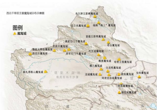 從地圖上我們可以明顯看到,北疆是魔鬼城的主要分布區域,甘肅、青海也有少量分布,實際上,在西北資料可查的雅丹地貌群就近百余處,它們一個個神秘地屹立在西北疆域上,成為了寂寞荒原上的一場視覺盛宴,數量之多,形態之多,就像是一個神秘而龐大的“魔鬼”家譜,實際上,它們并不是被人類遺棄或鬼神建造的“古城”,而是經過風蝕形成的一種特有地貌景觀,用我的話講就是被風吹了多少年的一堆大土丘~可是深入其中,高高低低的“建筑群”投下錯亂光影,在這里幾乎看不到任何生命的跡象,因為鐵含量過高,磁場不穩定, 指南針進入雅丹地貌經常會不管用,尤其在夜深人靜,遇到風吹,聲音似鬼哭狼嚎,極其陰森恐怖,故被稱為“魔鬼城”。如果晚上在魔鬼城里露宿一夜,想必也會是一種奇妙的體驗~