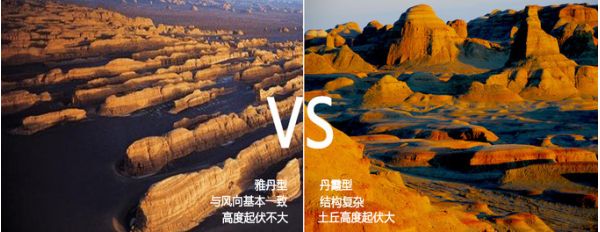 這里我先給大家po上兩個名詞解釋。雅丹—維吾爾語譯名,指風力吹蝕未固結、較松散的河流和湖泊沉積物而形成的一些“陡峭的土丘”,在干旱區分布廣泛;丹霞—是經由地殼抬升后,由流水、風化和重力等作用塑造而成,“頂平、身陡、麓緩”,巖性堅硬,年代遠比雅丹古老。