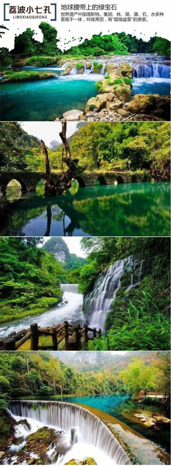 上午:酒店用早餐后前往國家 AAAAA 級風景區 【小七孔】 (游玩時間約4小時);景點之間需換乘電瓶車 (電瓶 車 40 元/人,景區保險 10 元/人,費用自理)小七孔景區因一座建造于道光十五年間(1836 年)的 【小七孔石橋】而得 名;景區被稱之為 “超級盆景”,集山、水、洞、林、湖、瀑布等為一體,在長不到 2 公里的峽谷內,起迭著 68 級瀑布,順 贄而下,奔瀉而去【68 級跌水瀑布】?!?strong>拉雅瀑布】精巧醉人,水珠飛濺;而長不到 600 米之水上森林,樹根盤在錯石上, 清澈的水流沖刷著青石,行走于其中,若身臨瓊瑤仙池。拱壩截水而形成的 【臥龍潭】水從壩頂傾瀉下來,如一道銀色的 水簾掛在眼前,壯觀而又秀美,水面經過吸收、反射和折射,呈現各種藍色,真是美如仙境。
