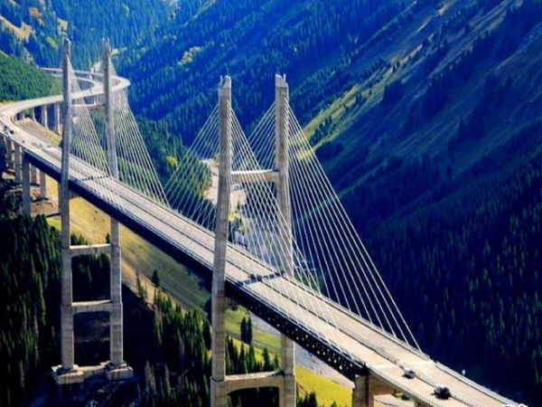 果子溝大橋全稱果子溝雙塔雙索面鋼桁梁斜拉橋,該橋地上部分建設于07年8月22日開始澆筑。果子溝大橋是國道045線賽里木湖至果子溝口高速公路建設項目控制性工程之一,橋梁全長700米,橋面距谷底凈高達200米,主塔高度分別為209米和215.5米,大橋主橋全部采用鋼桁梁結構,使用國內特殊專用橋梁鋼材17000噸,并采用高強螺栓連接,安裝精度控制在兩毫米以內。大橋是自治區公路第一座斜拉橋,也是國內第一座公路雙塔雙索面鋼桁梁斜拉橋。