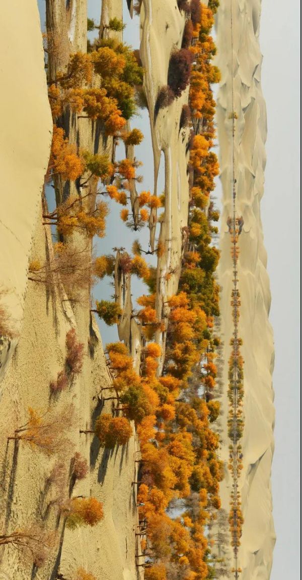 她雖身處于中國流動最大的塔克拉瑪干沙漠,但依舊樂觀。用耀眼、跳躍的金黃點綴了滿目荒蕪的漠黃。 她雖然身處沙漠,心中卻似乎向往水鄉。因為這兒,有著涓涓河流,金黃潑在兩岸,身影倒映水中。