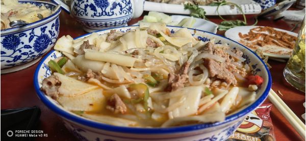 午餐吃的羊肉和面皮,羊肉鮮嫩而不膻,配合辣椒蘸料和蒜瓣,真是一道人間美味;面皮就更有講究了,據說武威面皮子在本類食品中的制作方法、口感全國獨一家,是因制作時要加蓬灰。蓬灰這種東西,其主要成分是碳酸鉀。據現有資料,面食中加蓬灰的只有蘭州牛肉面和涼州面皮子。加蓬灰,面得筋而精,使面筋而精的東西也多,獨有蓬灰,在蘭州牛肉面和涼州面皮子中無其它物可替代。雖說現在蓬灰有了工業生產品,用起來也方便,但終究不如用土法燒制的蓬灰做出來的地道。洗、蒸面皮子辛苦。洗時將面攪成糊狀,加適量蓬灰,一遍一遍澆洗,無法溜下籮兒的便是面筋。工序不復雜,但繁復,一遍又一遍。大清早起來要蒸,一扇一扇,十幾架籠架起來,火候如一,過火或火不透,都會影響面皮子的成分和質量。面皮子一出籠,倒扣在案板和其它有案面的東西上,抹上熟清油,不起眼的面皮子便亮旺旺地呈現在人們面前。好的面皮子吃起來確實筋道。不放任何調料,抓一塊放到嘴里咬嚼,也會食欲大增,這種吃法叫吃甜面皮。那種甜,與糖味無關。蓬灰加的多少、蓬灰材質的好壞、洗面皮子的人的手感、面的質量,都是好的面皮子受人稱道的條件。蓬灰加得多了,面皮子的味會苦,吃一口面皮,羊肉味道仿佛蘊含在面皮中,在口腔中釋放,面皮軟糯,味道醇厚,湯汁濃郁,來武威不吃一碗面皮,實屬可惜。