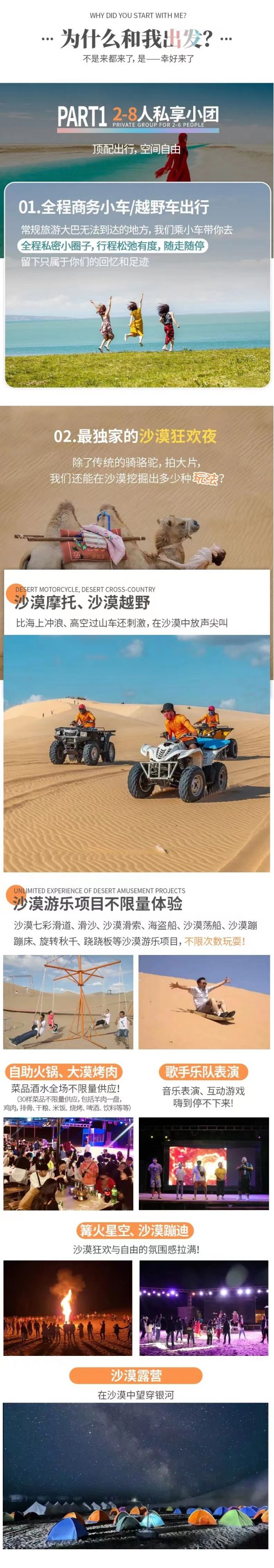 從石油小鎮(zhèn)出來隨后直達【敦煌】如時間充??蓞⒂^敦煌古城 ,最后我們抵達千年古城敦煌,有人說過,這里的風(fēng)都有歷史的氣息。今晚我們特地安排了沙漠露營!沙漠露營為贈送項目,可根據(jù)自己身體狀況自行選擇。包括沙漠摩托、滑沙、土火鍋、啤酒烤肉、沙漠演唱會、煙花表演、篝火晚會、鍋莊舞,之后分發(fā)帳篷睡袋在大漠星空下露營,銀河系清晰可見任何時節(jié)只要天空晴朗都可看見流星。