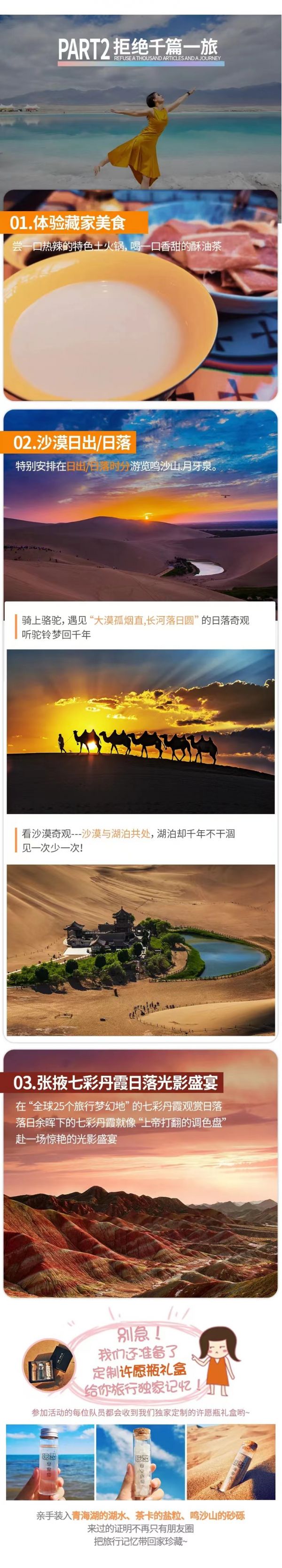 早上睡到自然醒,吃過早餐,前往中國版的“天空之鏡”【茶卡鹽湖】 。茶卡的天空異常干凈,在白色之上。與其說是天空之鏡,不如說是一場幻境,天地一線,在現(xiàn)實世界中早已很難找到如此純凈的地方,白得是如此的徹底,抬起頭,頭頂有著一片藍天,低下頭,腳下仍是一片藍天,已分不清是天空倒影在湖水中,還是湖水融化在藍天里。大家可以在鹽湖里奔跑嬉戲,盡情的凹造型拍照。