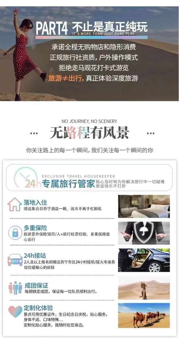 請對應(yīng)使用我方穿越大西北2-8人VIP私享小團9日行程,因使用其它行程造成的投訴,責(zé)任自負;請仔細閱讀以上行程文檔,同意并保證遵守我方安排,以免為您帶來不必要的麻煩;如產(chǎn)生合同糾紛或人身意外事故,按《中華人民共和國合同法》、《道路交通法》、《保險賠償條例》裁定;本行程作為旅游合同附頁與旅游合同同等法律效力。